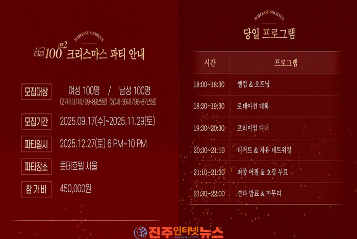 °áÈ¥Á¤º¸È¸»ç ³ëºí·¹½º°¡ ÁÖÃÖÇÏ´Â '½Ì±Û 100 Å©¸®½º¸¶½º ÆÄƼ'´Â ¿À´Â 12¿ù 27ÀÏ ¿ÀÈÄ 6½ÃºÎÅÍ 10½Ã±îÁö ·Ôµ¥È£ÅÚ ¼¿ï¿¡¼ ÁøÇàµÈ´Ù. ¿õÁøÇÁ¸®µå¶óÀÌÇÁ´Â Ãß÷À» ÅëÇØ 45¸¸¿ø »ó´çÀÇ ÆÄƼ ÃÊû±Ç 5¸Å¸¦ ÁõÁ¤Çϸç, ½Å·ÚÇÒ ¼ö ÀÖ´Â ¸ÅĪ ÀýÂ÷¿Í °ÝÁ¶ ³ôÀº È£½ºÇÇÅ»¸®Æ¼¸¦ °áÇÕÇÏ¿© °í°´µé¿¡°Ô ÀØÁö ¸øÇÒ ¿¬¸» Ãß¾ïÀ» ¼±»çÇÒ °èȹÀÌ´Ù.