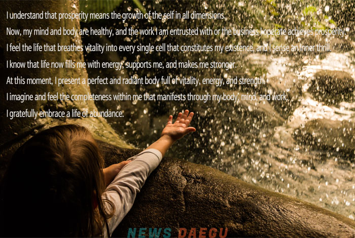 I understand that prosperity means the growth of the self in all dimensions.Now, my mind and body are healthy, and the work I am entrusted with or the business I operate achieves prosperity.I feel the life that breathes vitality into every single cell that constitutes my existence, and I sense an inner thrill.I know that life now fills me with energy, supports me, and makes me stronger.At this moment, I present a perfect and radiant body full of vitality, energy, and strength.I imagine and feel the completeness within me that manifests through my body, mind, and work.I gratefully embrace a life of abundance.